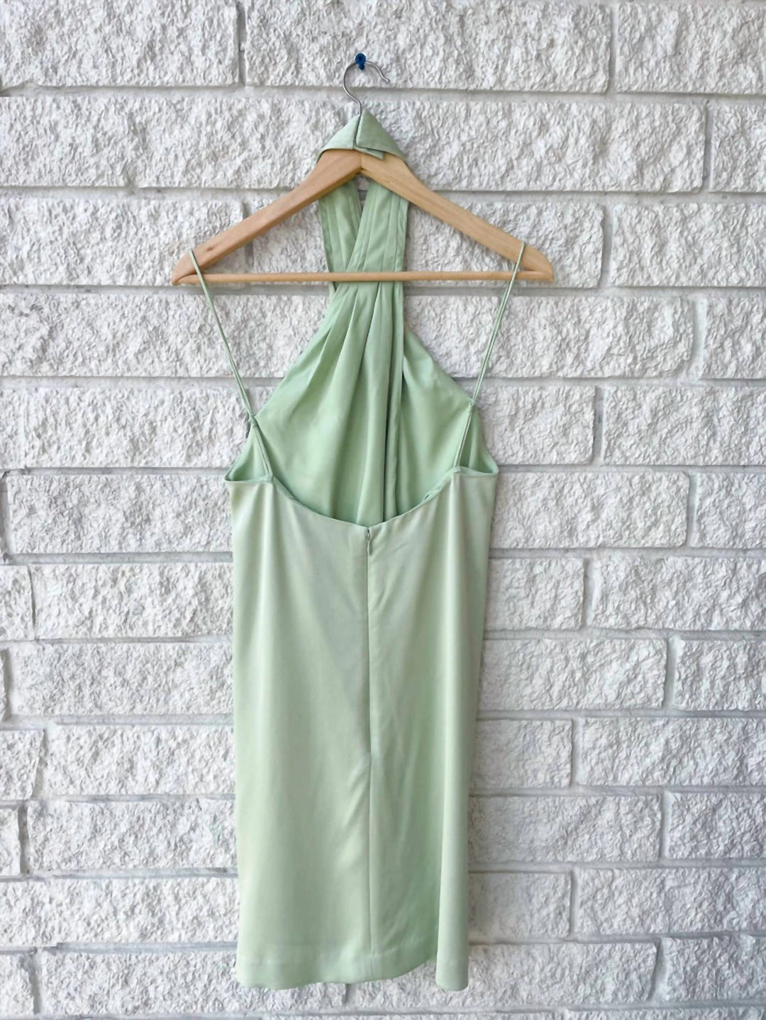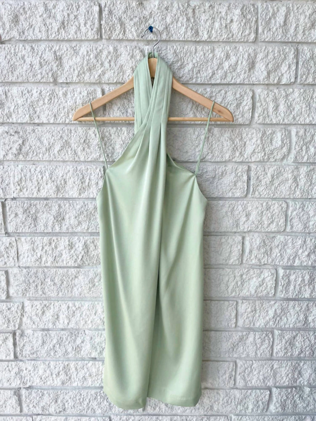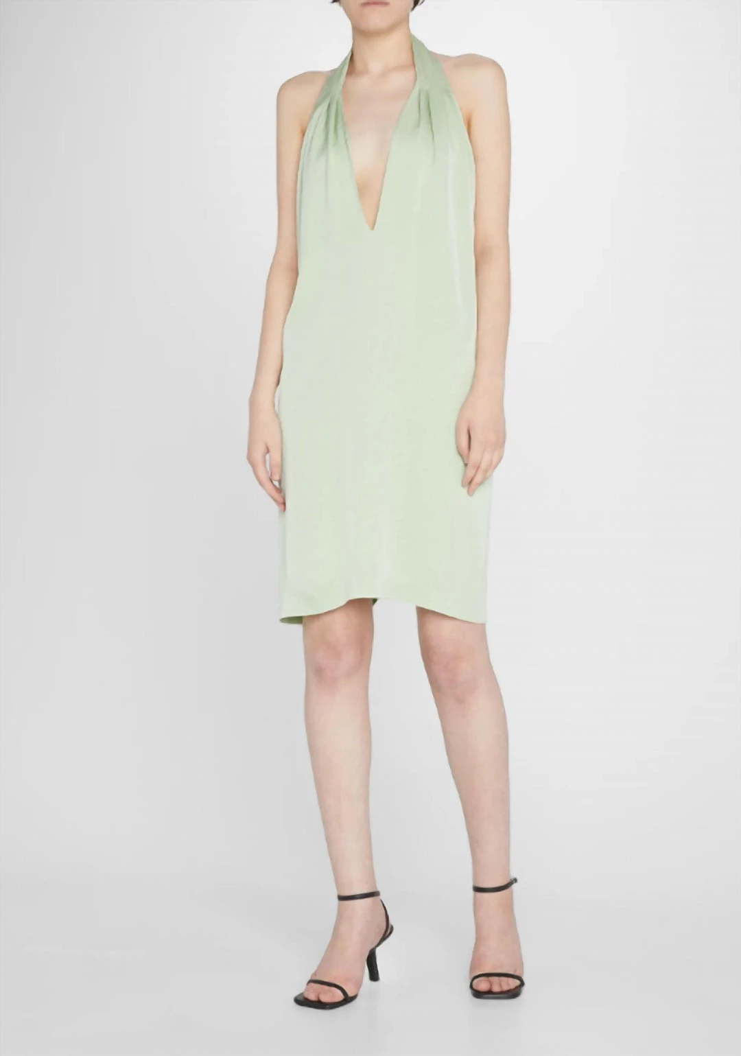 Mini dress with a halter neckline.οΏ½οΏ½The halter neck has a twisted cross over look that adds a ruched effect across the neckline. The bodice has a relaxed fit and drapes over the body.οΏ½οΏ½Dry Clean Only