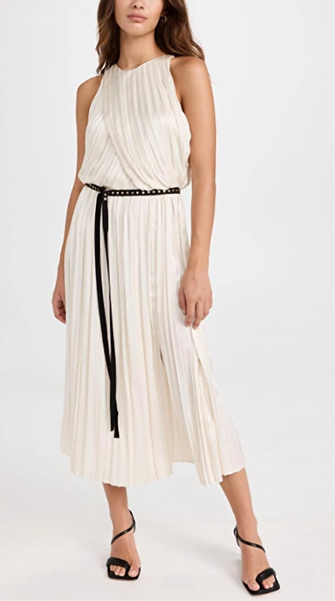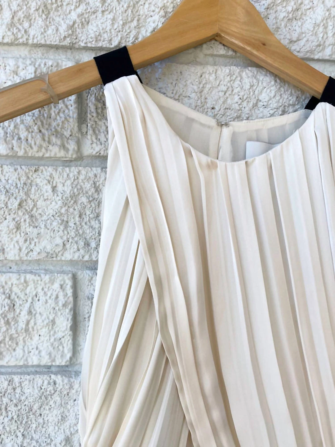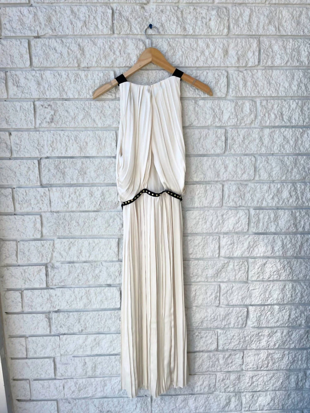 This dress has pleated detailing throughout. It has a bedazzled belted waist wrap. It has an asymmetrical top half that cinches at the waist. The straps are black with a small open lower back detail.