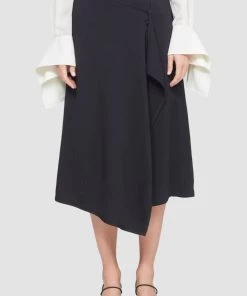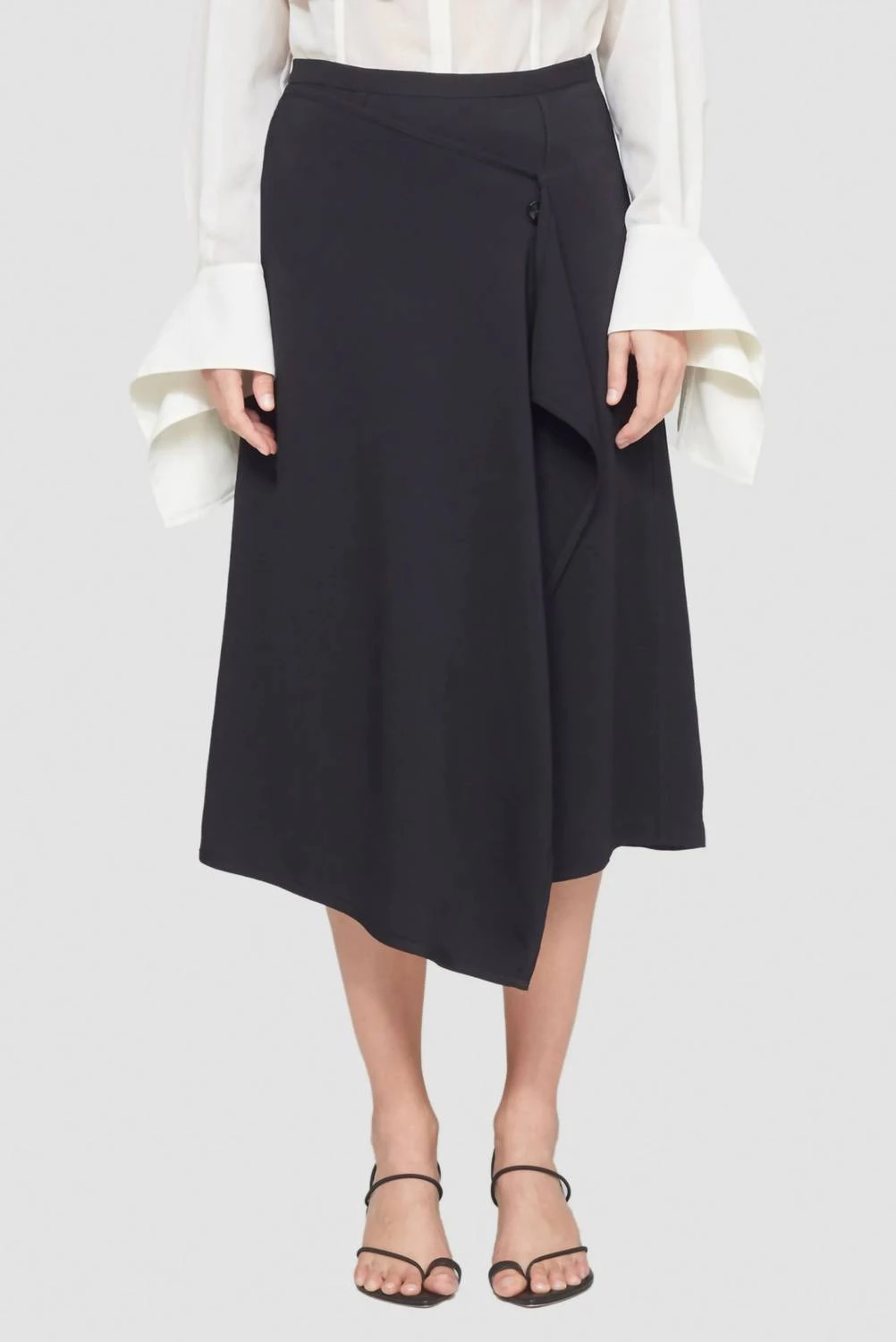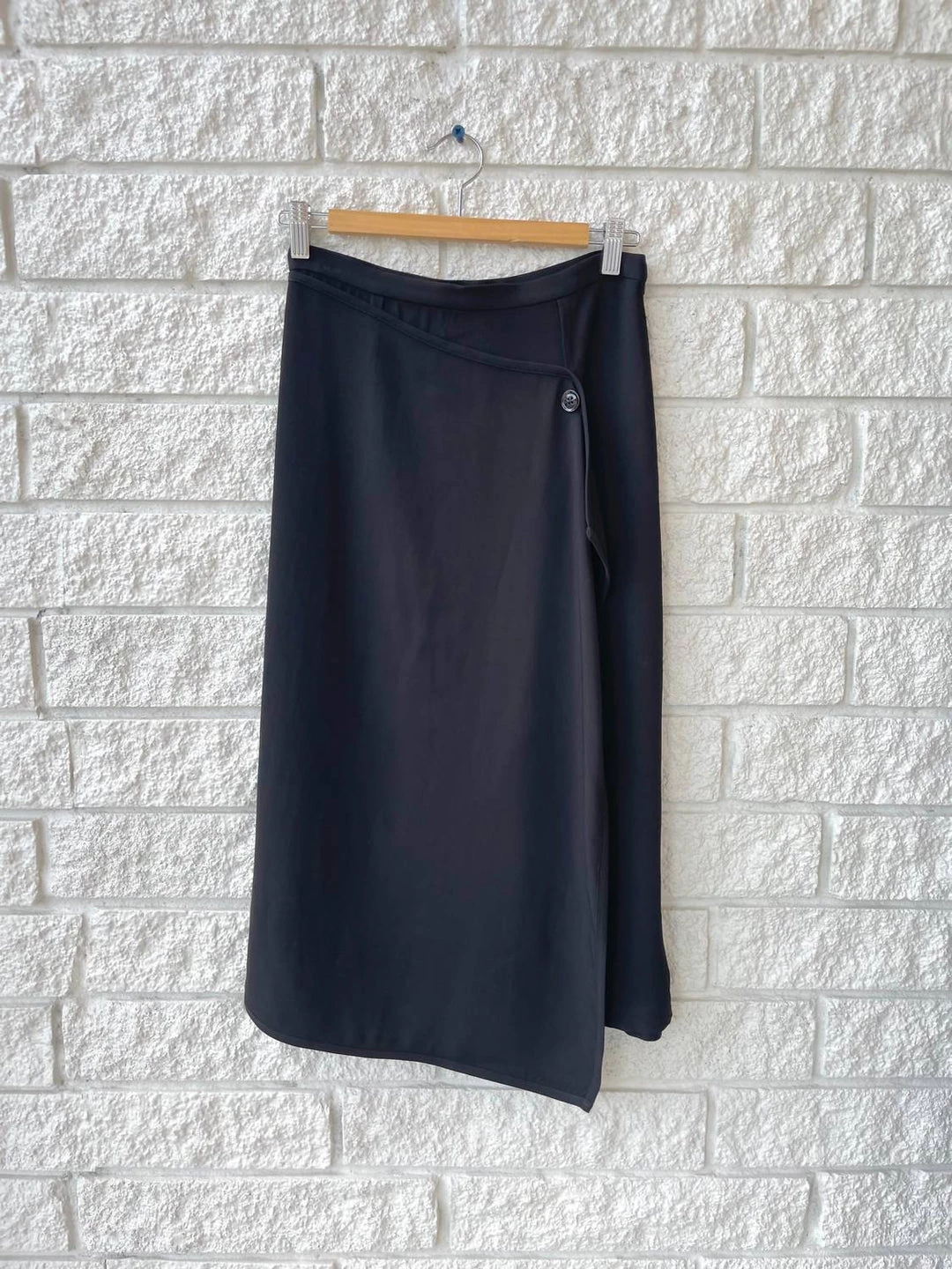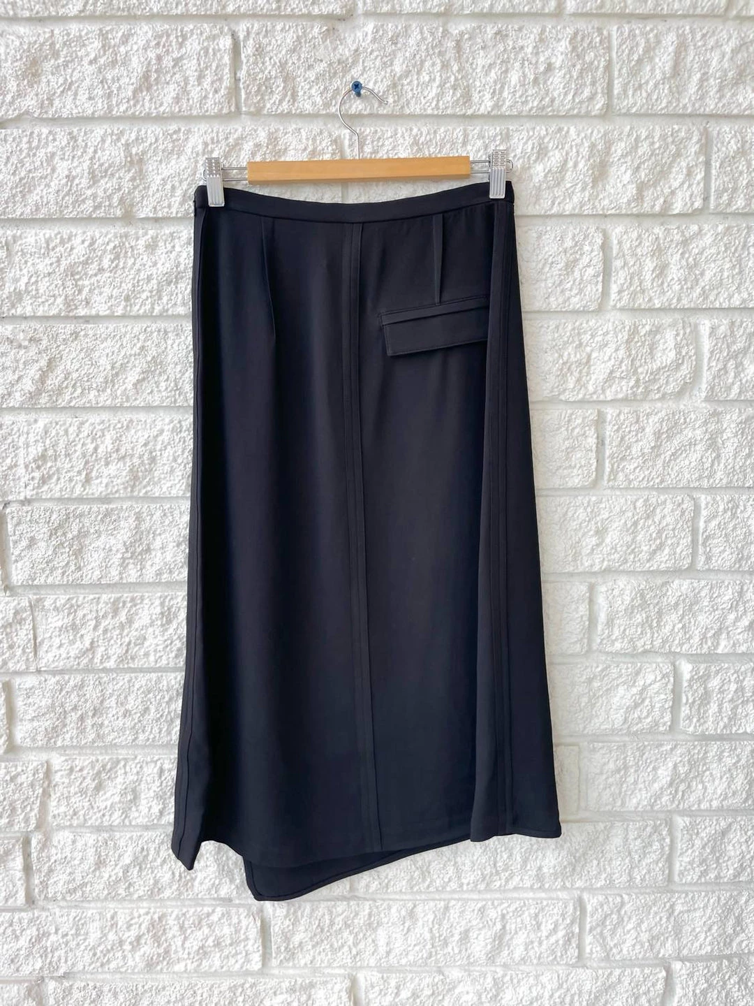 Tailored wrap skirt that has a panel that drapes across the front creating an asymmetrical hemline and wrap effect.οΏ½οΏ½It featuresοΏ½οΏ½a single back flap pocket with a side button closure.Professional dry clean only