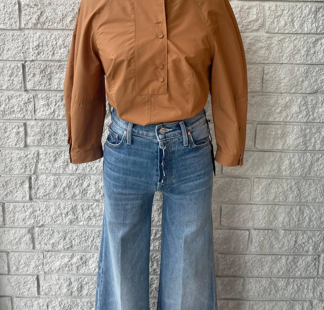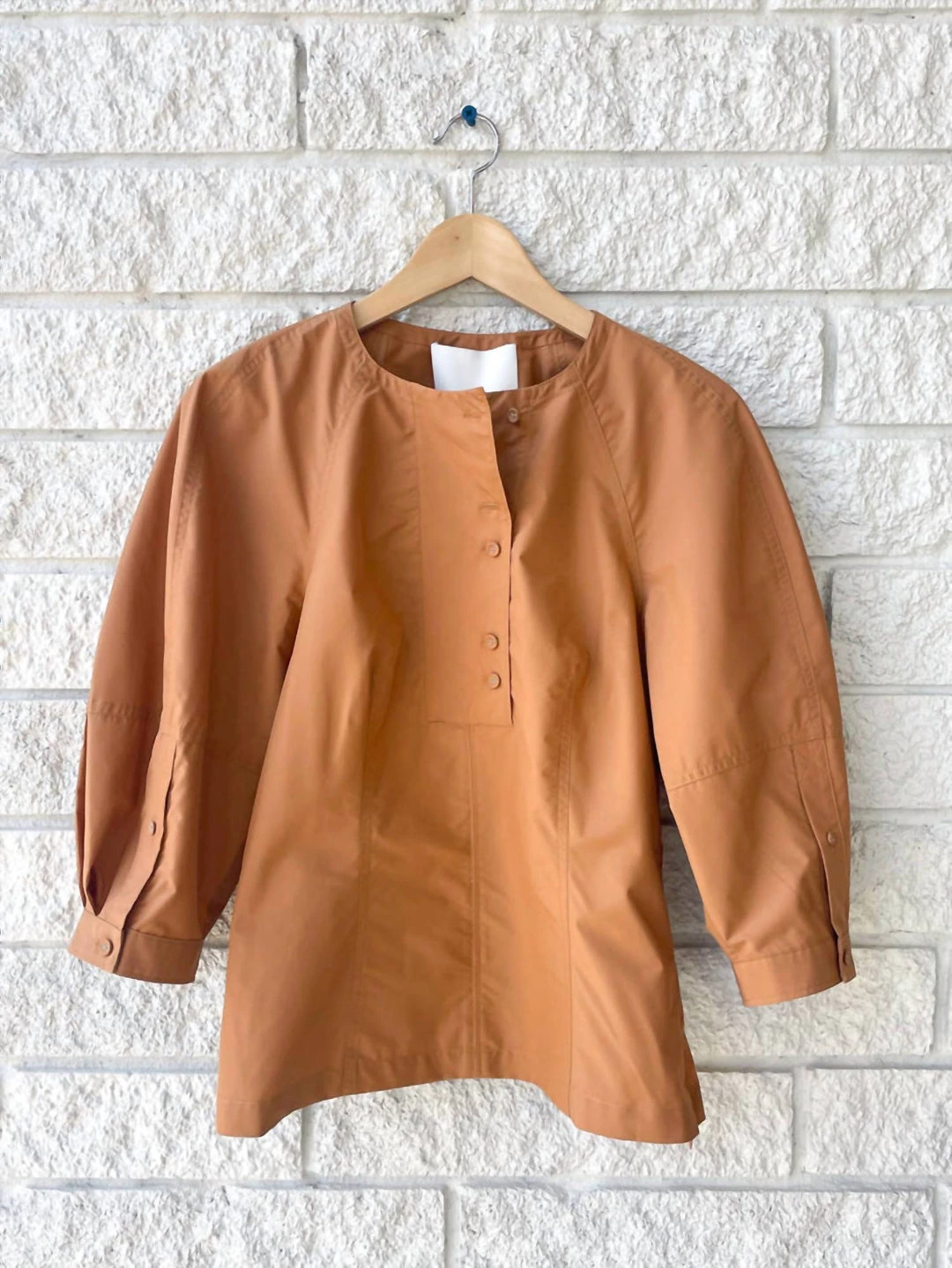 Blouson three quarter sleeve top with a high neckline.οΏ½οΏ½The blouse has buttons going half way down the bodice on the left side of the chest. The bodice of the blouse is structured in a slim fit.οΏ½οΏ½Dry clean only
