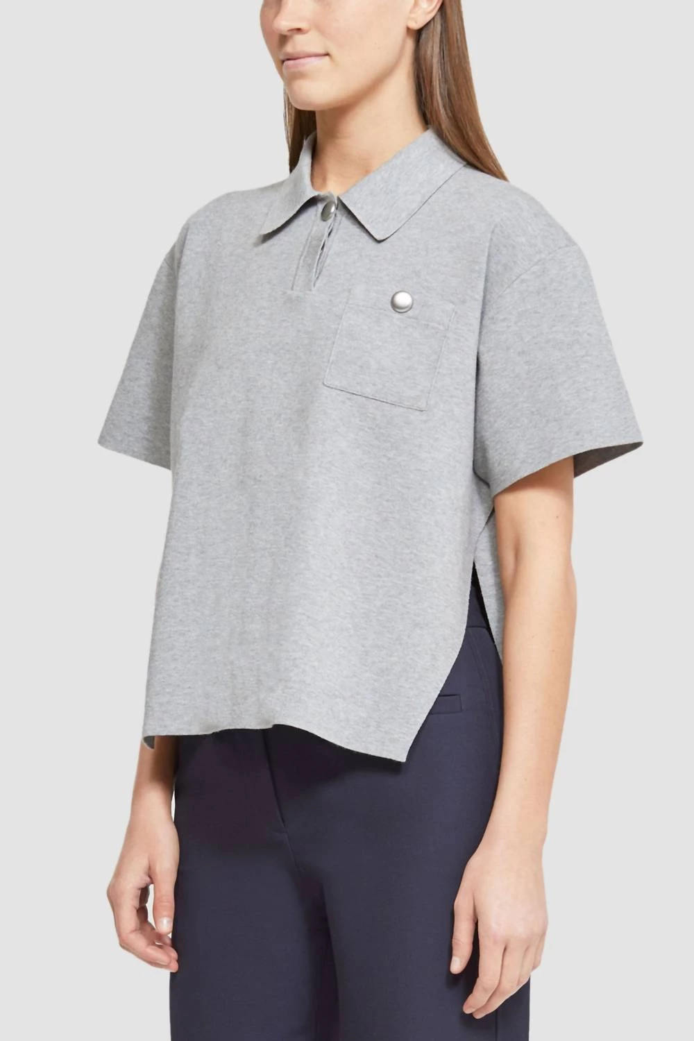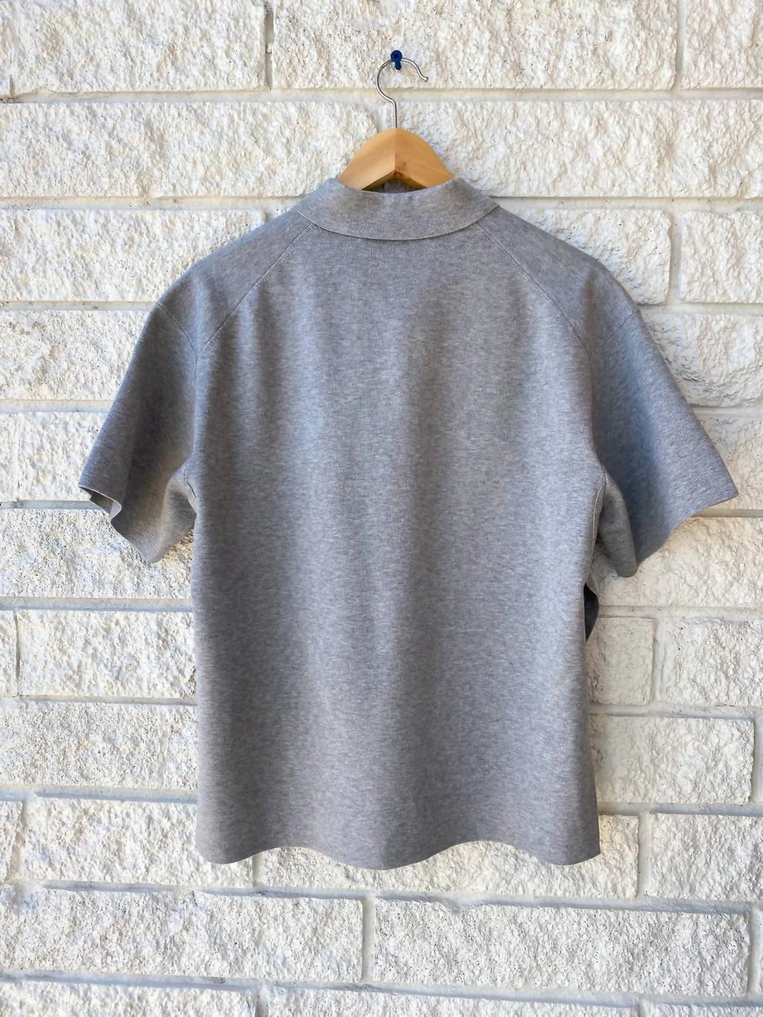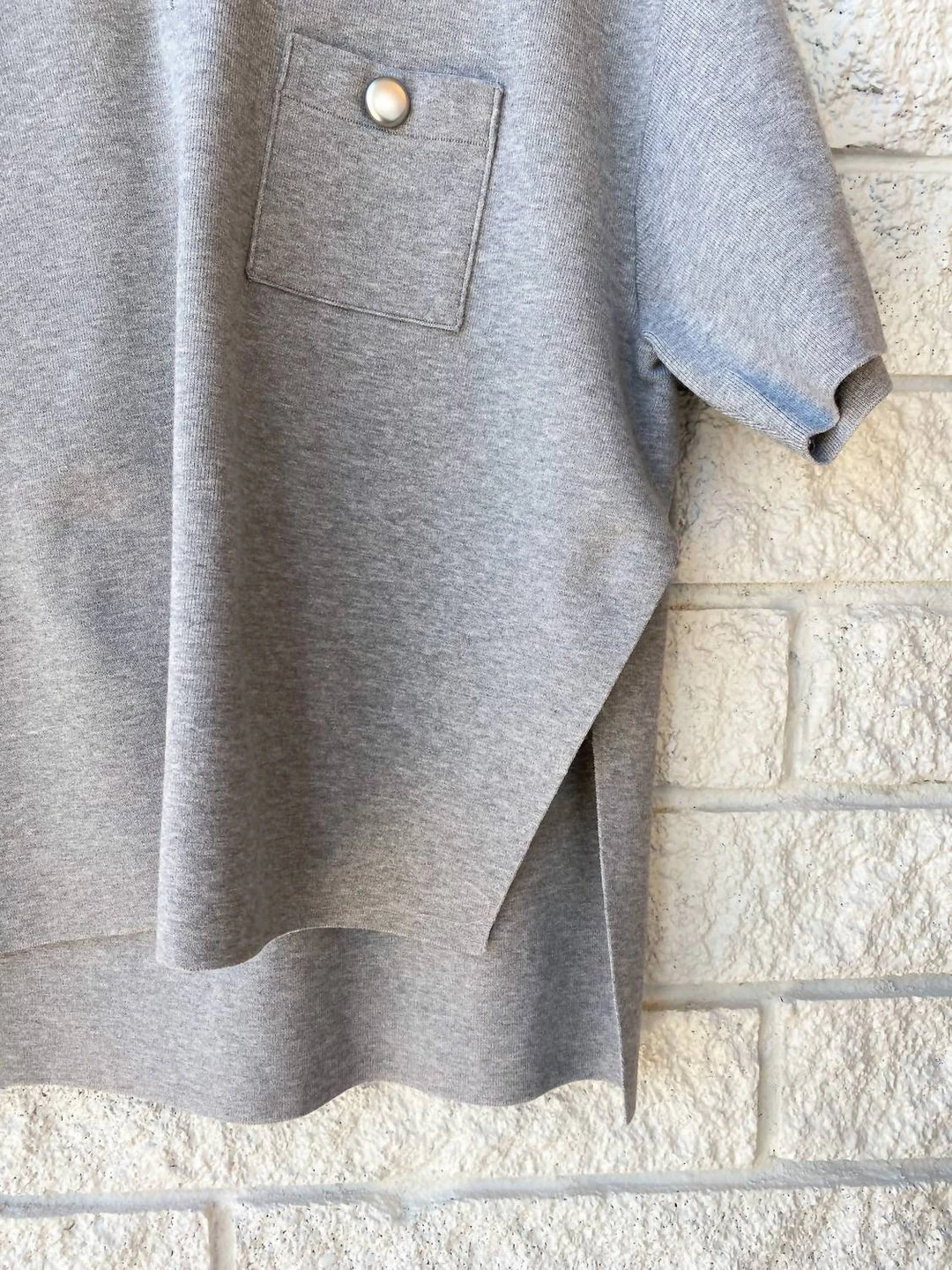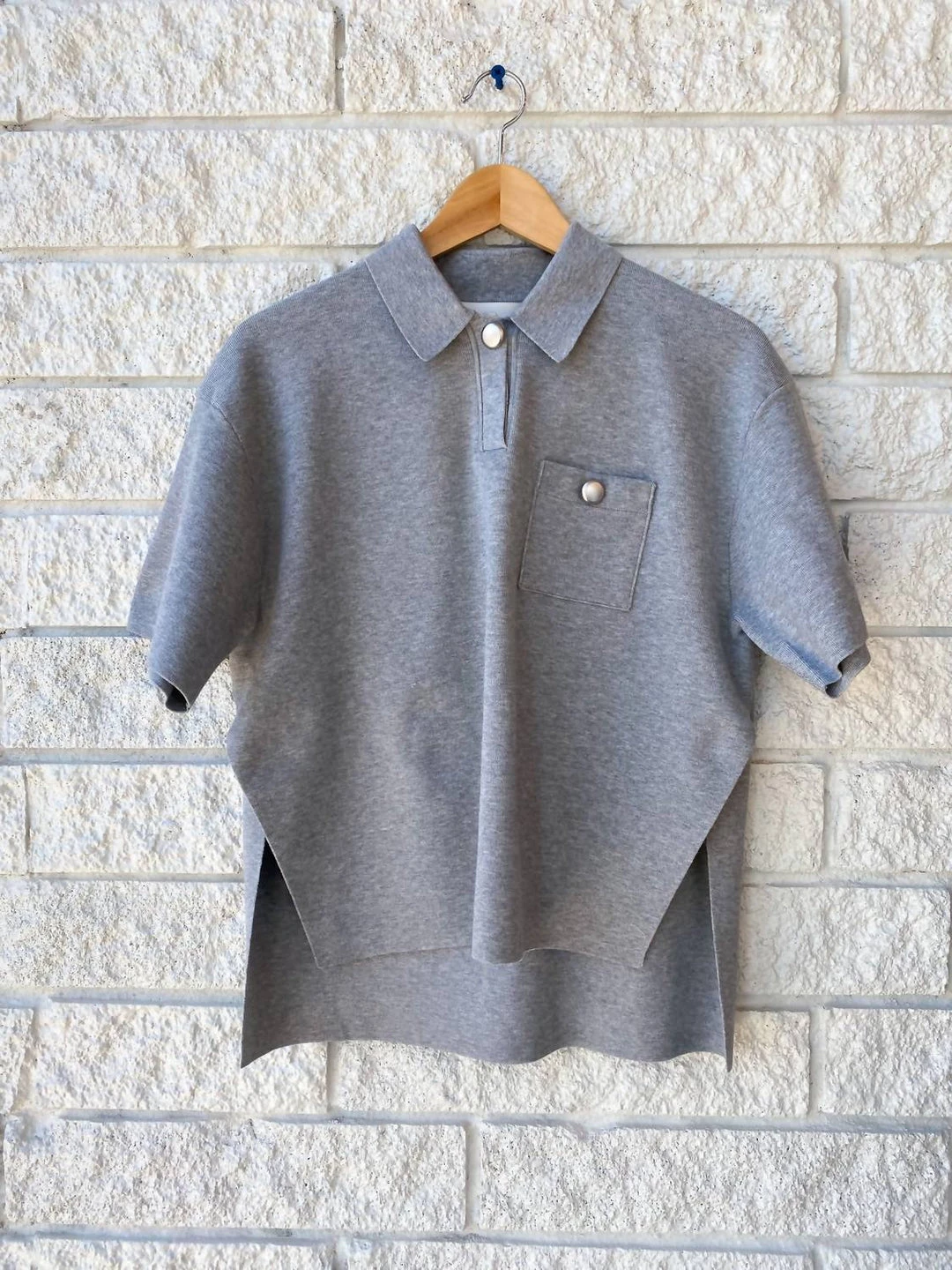 This short sleeve top has a collar with a large single button front closure. It has side slits with a step hem making the shirt longer in back. It has a single patch pocket with a large button on the front left chest.Professional dry clean only