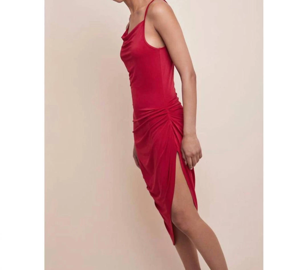 A cowl neckline, ruched detailing at the hip, asymmetrical slit, and ultra soft jersey fabric combine to create a subtle yet sexy little black dress.
