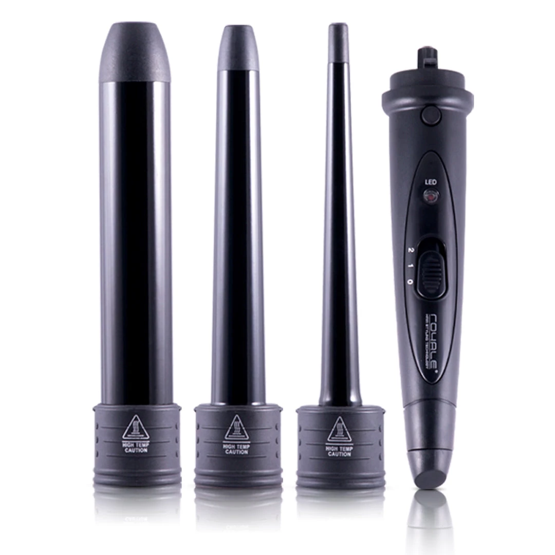 The Royale curling iron will give you exactly the look you seek. Includes three interchangeable barrels in sizes 18/9 mm, 25/18 mm, and 32 mm. Beautifully designed, slim, lightweight, and ergonomic for creating silky smooth curls that hold through the day. The tourmaline ceramic barrel uses far-infrared technology, heating the hair from the inside out to minimize heat damage, and uses negative ions to eliminate frizz and static.